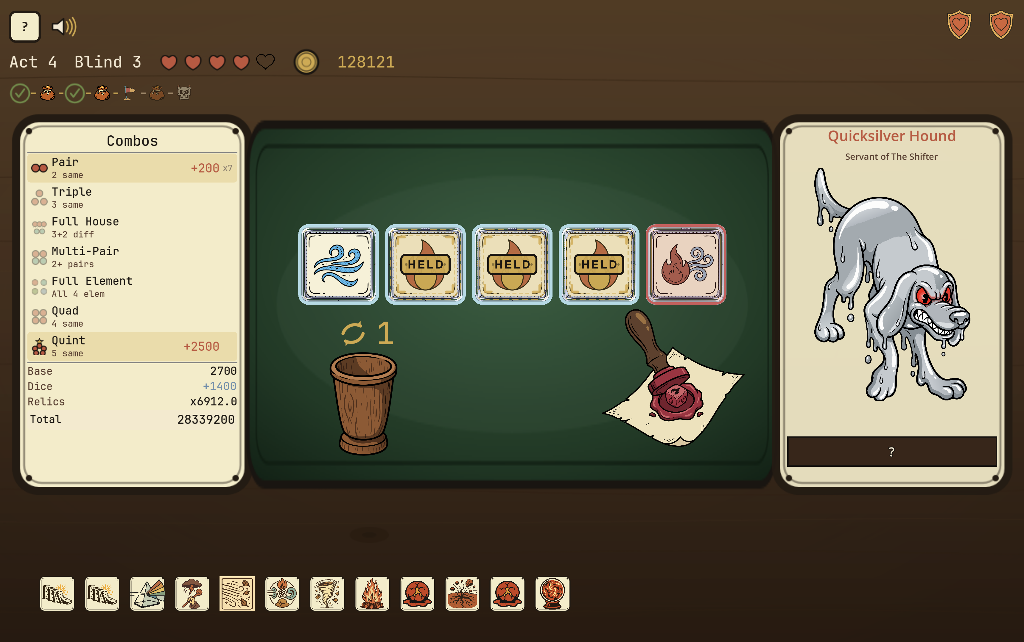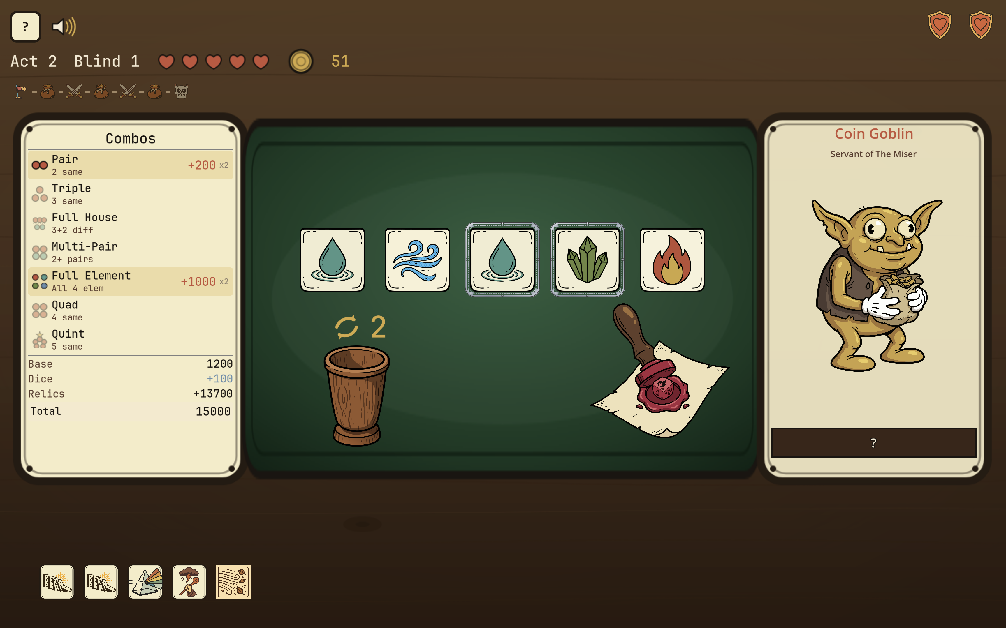 Action | Keyboard | Mouse ------------------------+-----------------+------------------------ Reroll | R | Click the wooden cup Submit | Enter | Click the wax seal Hold or release a die | 1 2 3 4 5 | Click the die Help booklet | ? | Click the book icon