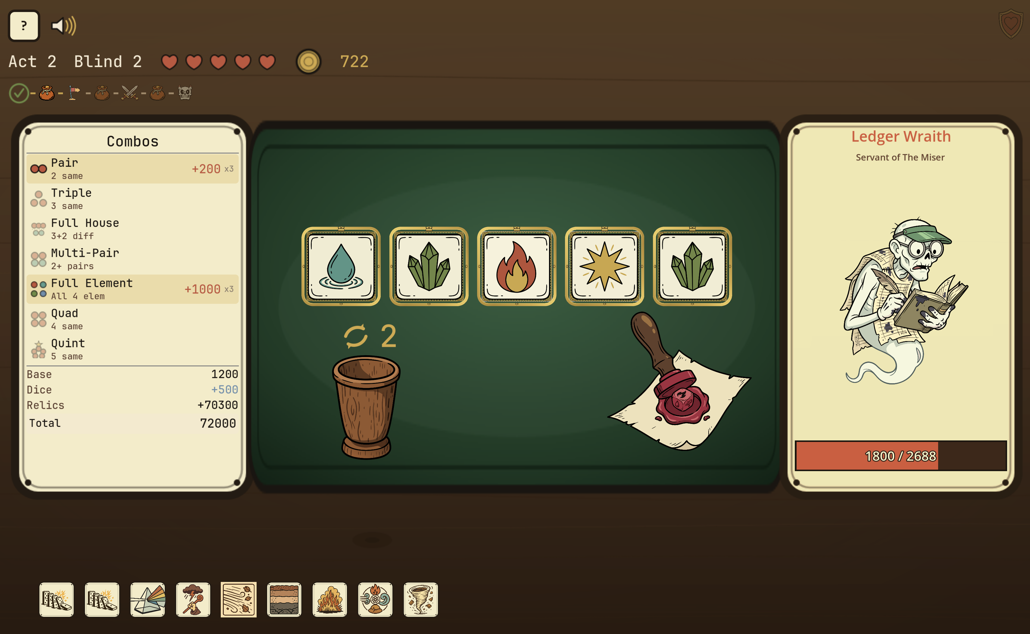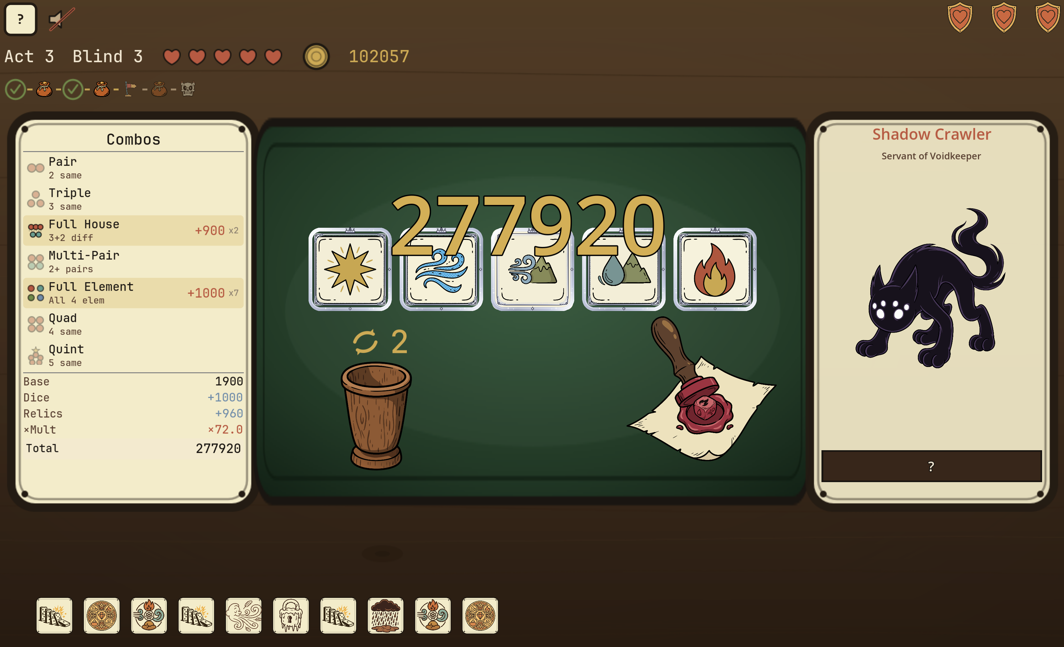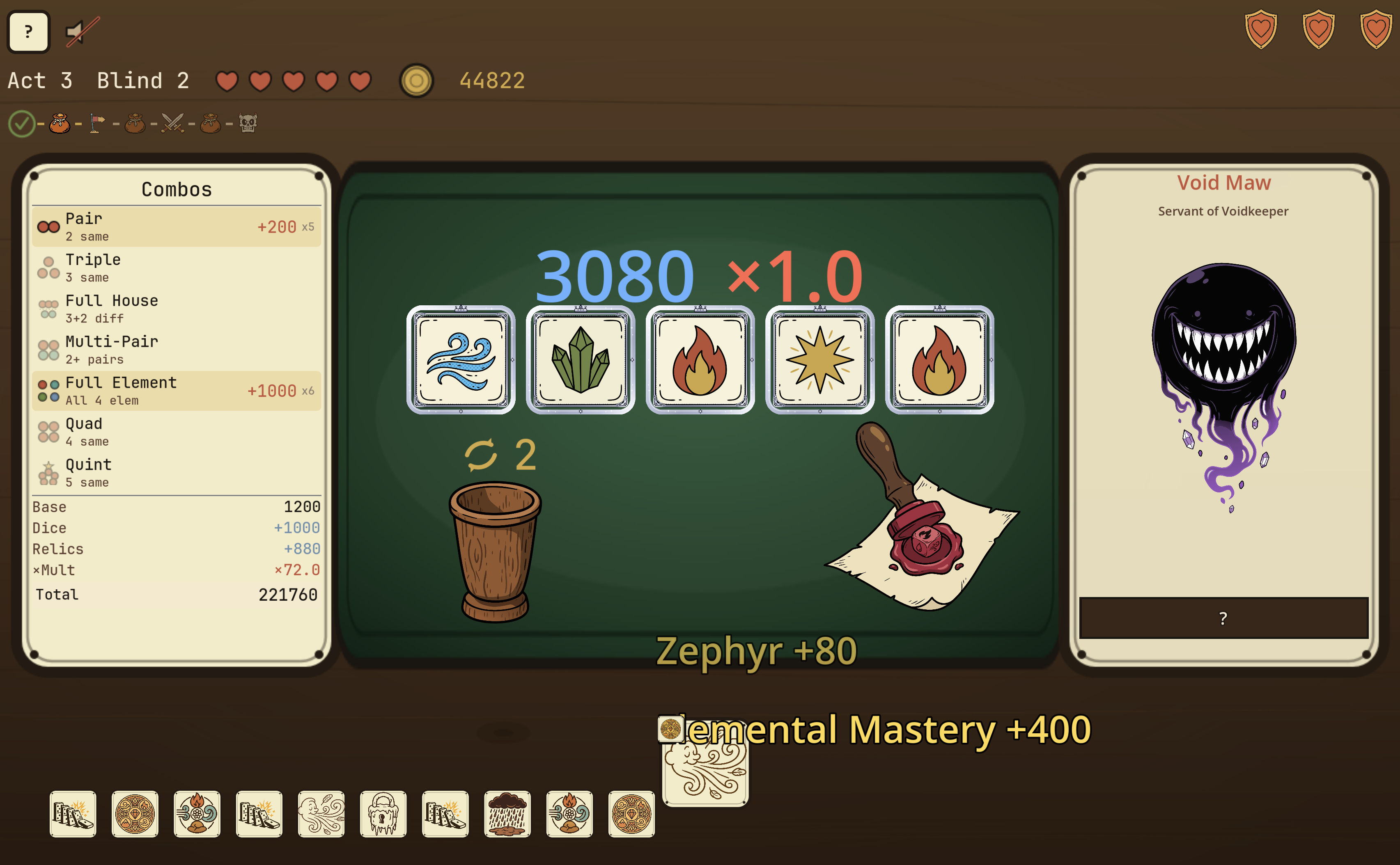 Every run is a deck building puzzle. You start with plain dice and grow a roster of relics that bend the scoring rules in your favor. Read the board, commit to a strategy, and push your luck. One bad round and the boss takes a heart.