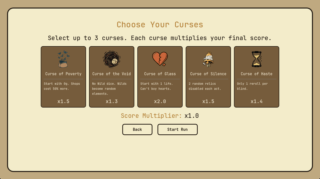 Was the game too easy? Play with curses to add extra difficulty to your game. Choose up to 3 curses at the time. This is only available after passing Solo Run at least once.